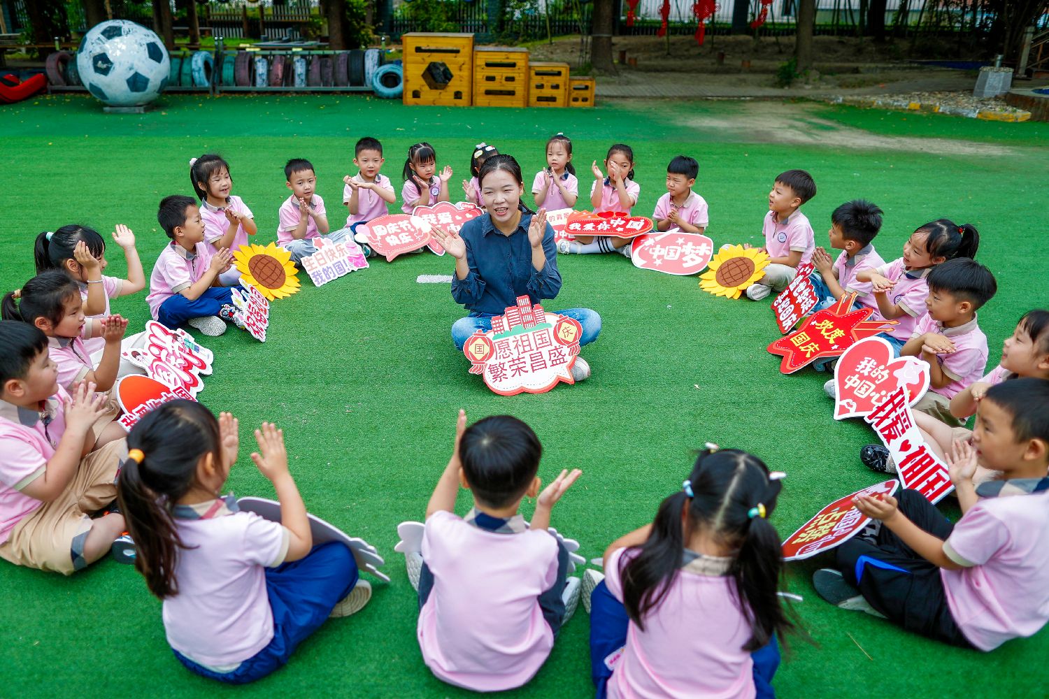 9月26日,在江苏省兴化市四牌楼幼儿园,老师带领小朋友们学唱爱国歌曲。