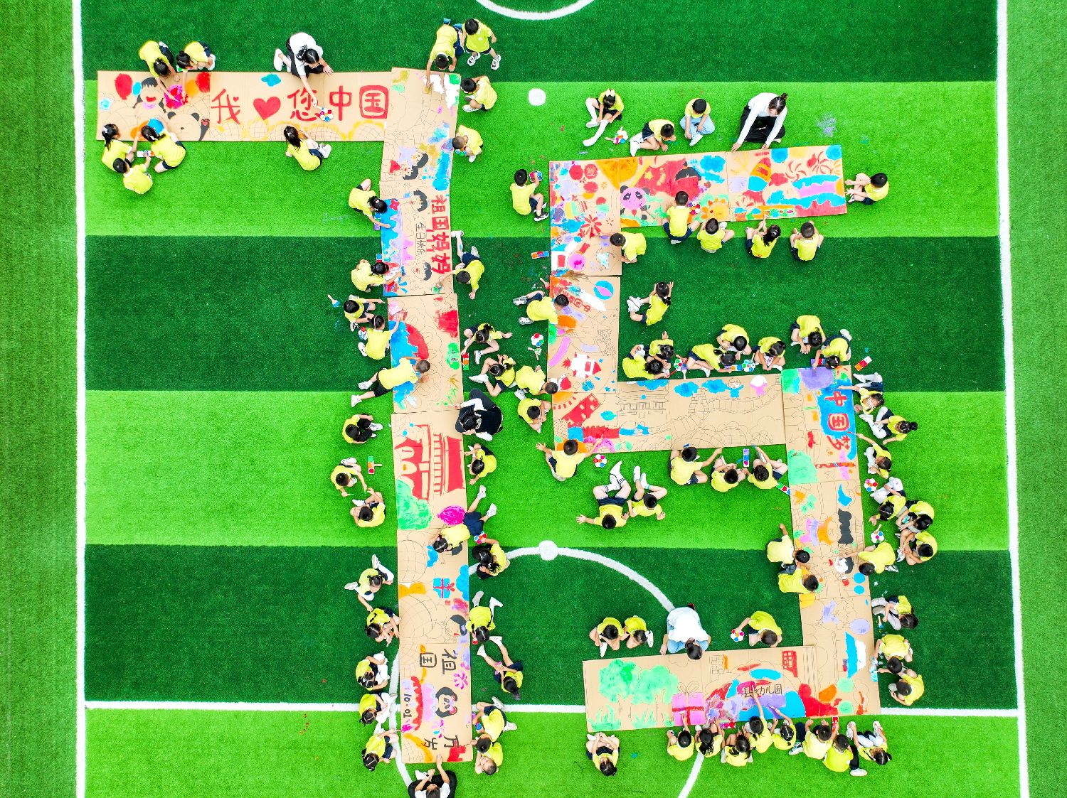 9月26日,江西省宜春市铜鼓县幼儿园的孩子们在操场上创作国庆主题绘画作品(无人机照片)。