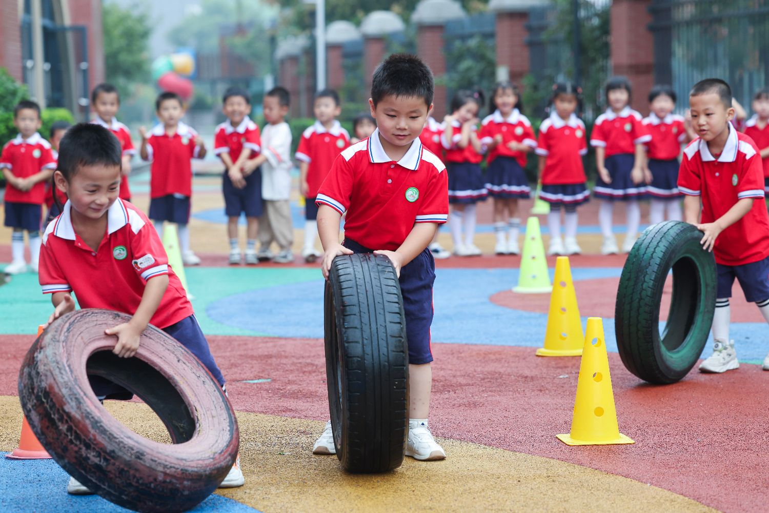 9月26日,浙江省湖州市长兴县开发区中心幼儿园开展迎国庆快乐游戏节活动。孩子们在老师的带领下在闯关运动游戏中拼搏,在快乐的氛围中迎接即将到来的国庆佳节。图为孩子们在参加滚轮胎趣味比赛。