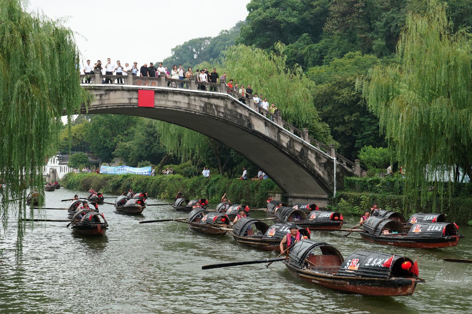 9月27日,2024“运河争辉”乌篷船马拉松邀请赛在浙江绍兴浙东运河越城区段举行。历史悠久的乌篷船是绍兴独特的水上交通工具,举行比赛的浙东运河是中国大运河的重要组成部分,水乡绍兴以这种特殊的活动方式庆祝中华人民共和国成立75周年,同时也纪念中国大运河申遗成功10周年。图为在浙江省绍兴市越城区东湖景区,参加乌篷船比赛的船老大们划船出发。