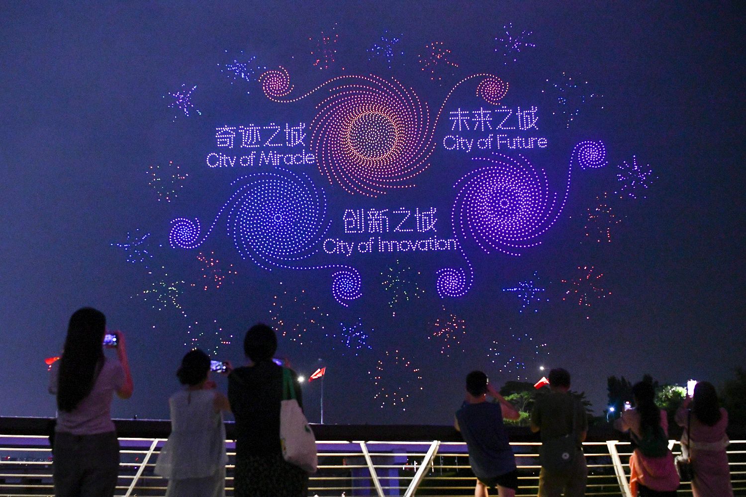市民、游客在深圳湾观看无人机表演。