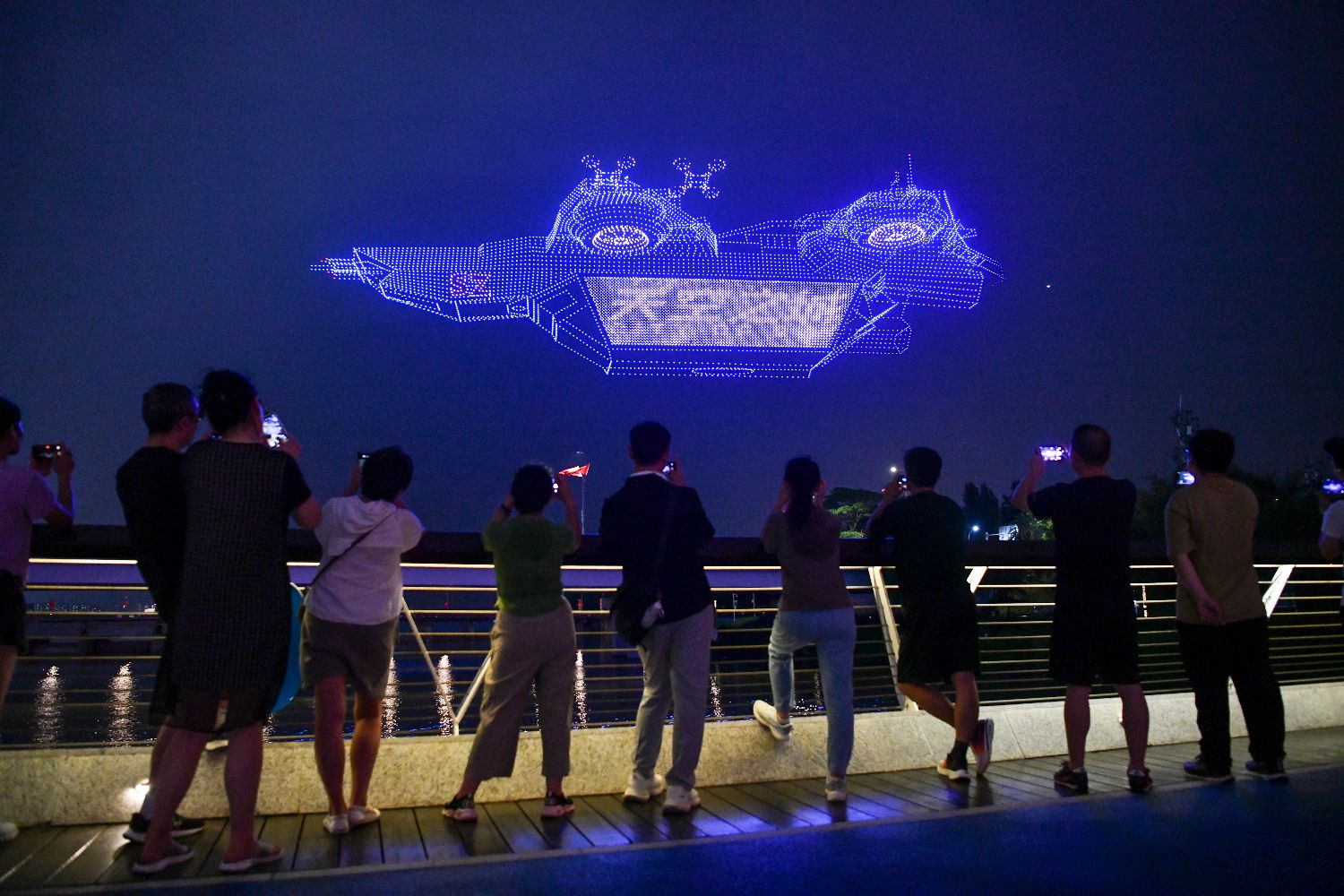 无人机在深圳湾上空组成深圳市地标建筑物图案。