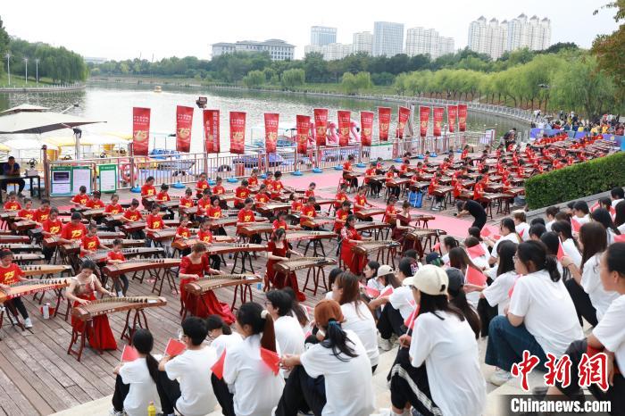 国庆节临近,河北省衡水市滏阳河畔一文化广场,260名古筝艺人正在共同弹奏乐曲。《万疆》《沧海一声笑》《男儿当自强》等多首流行歌曲曲目在古筝艺人的指下行云流水,时而激昂紧凑,时而舒缓悠扬,别有一番韵味。古筝演奏的同时,140名模特身着各式旗袍走秀。衡水市桃城区举办的此次活动以“古风韵桃城 国乐贺盛世”为主题,旨在丰富广大群众文化生活,以“筝”为媒,展现中华传统乐器的魅力。图为古筝弹奏现场。中新网