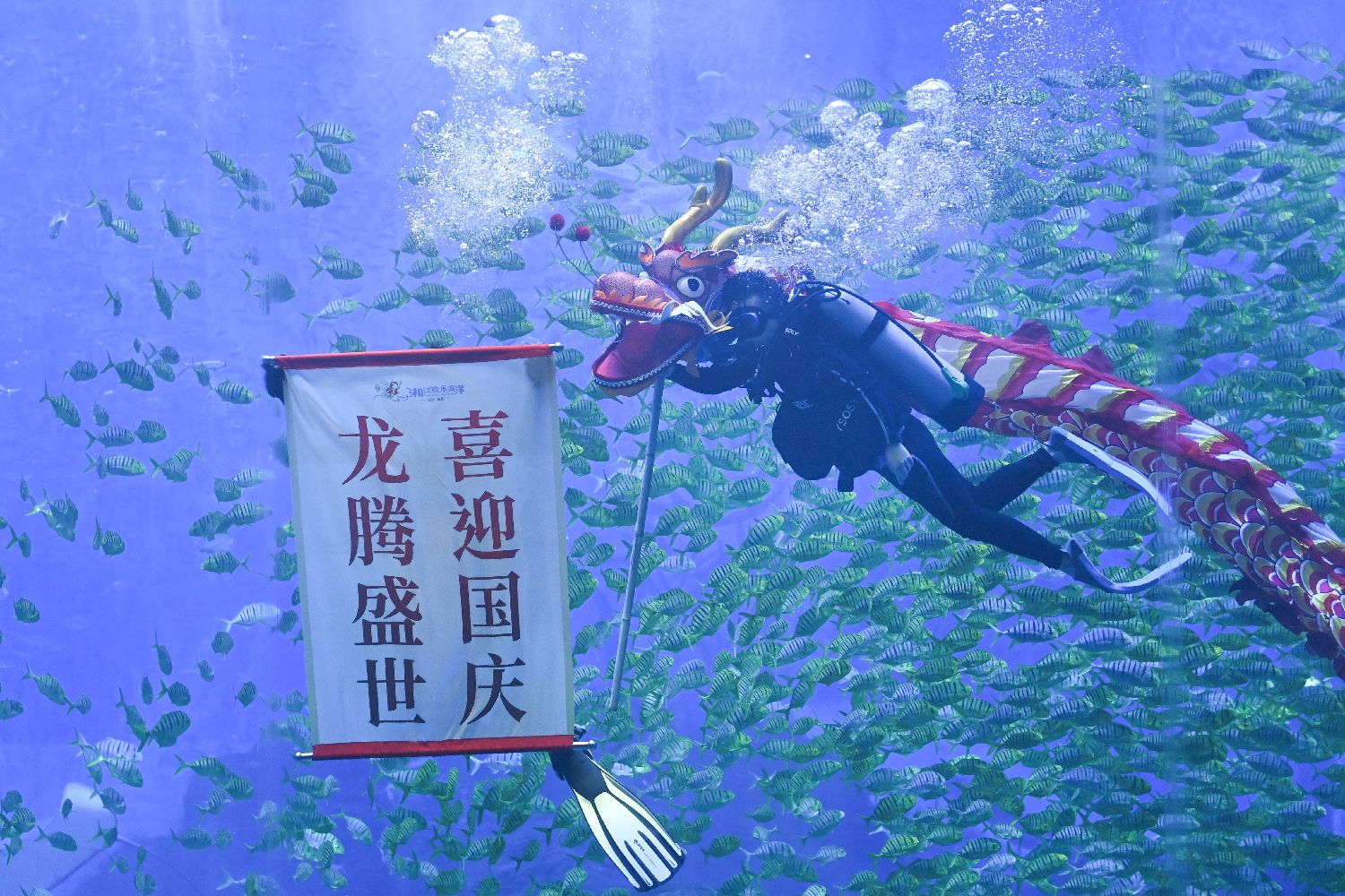 中国国庆节临近,各地开展丰富多彩的活动,表达对祖国的美好祝愿,喜迎国庆节。 9月29日,湖南长沙湘江欢乐海洋公园的潜水员带着标语与龙头潜入池中,将中国舞龙与潜水技能结合,进行水下舞龙表演,庆祝即将到来的国庆节。图为潜水员在水下舞龙并展示迎接国庆的标语。中新社