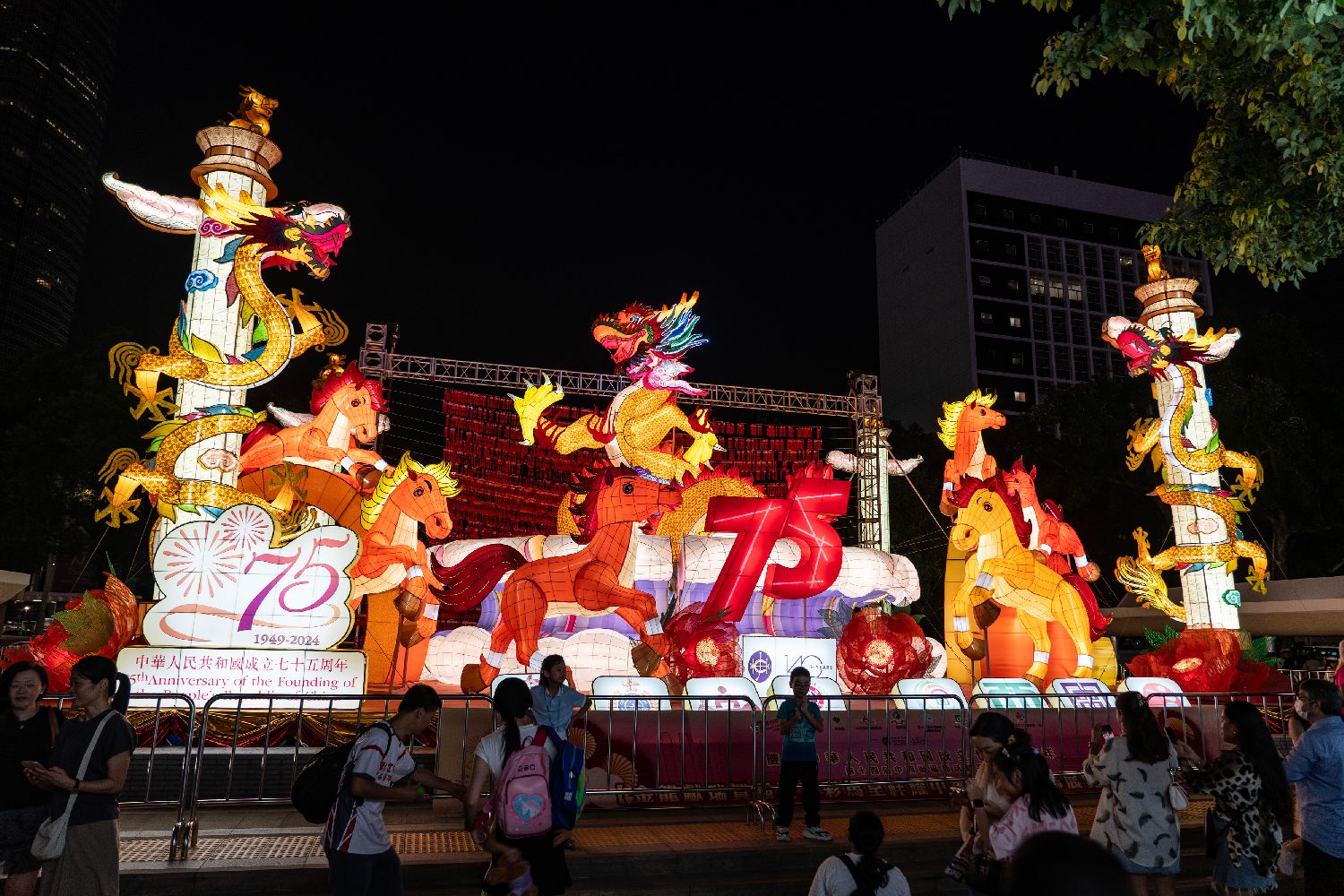 9月29日晚,香港中环点亮的一组大型国庆75周年花灯吸引过往市民游客驻足欣赏拍摄。中新社