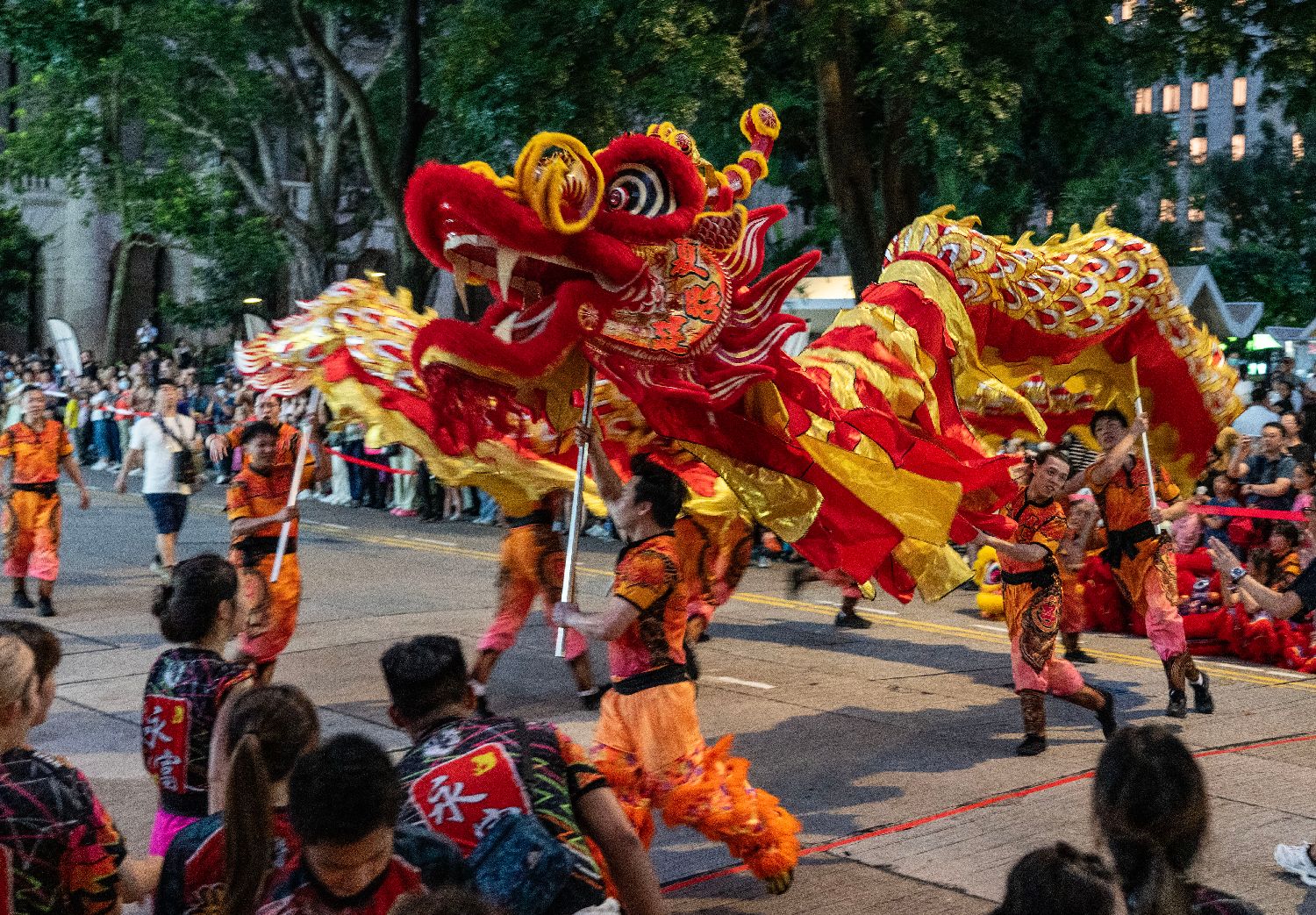 9月29日晚,为迎接新中国成立75周年,“中华龙狮大汇演”活动在香港中环举行,8条舞龙和75只舞狮同场演出,营造出热烈的庆祝氛围。图为中环街头舞龙表演。中新社