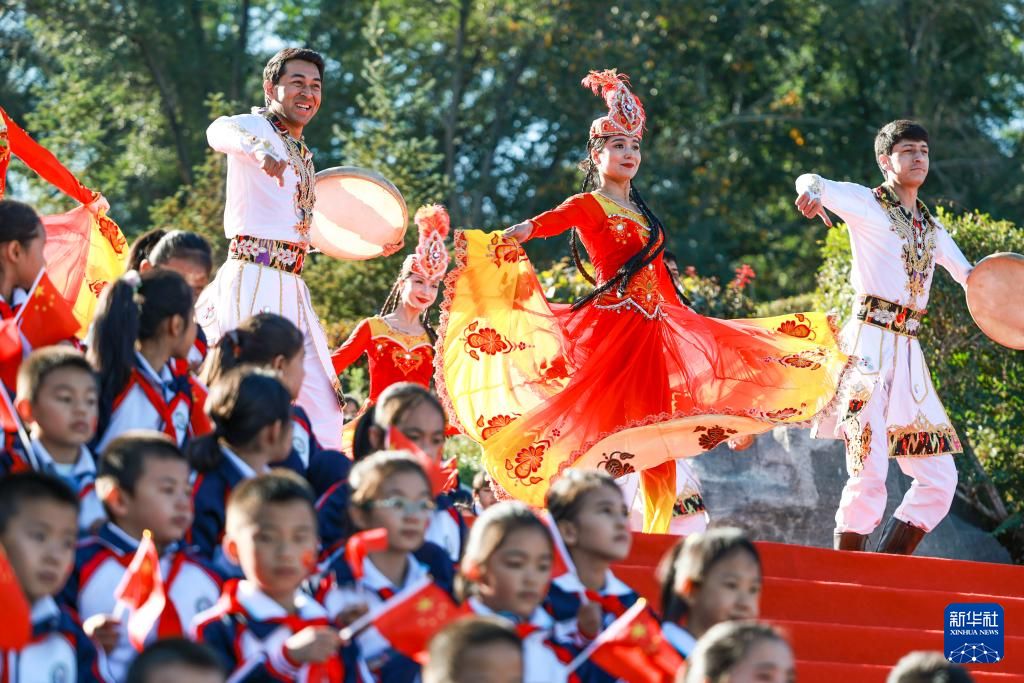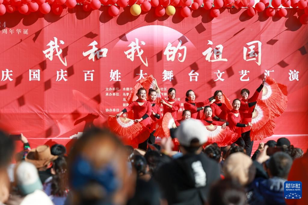 9月29日,乌鲁木齐市水磨沟区水磨沟街道北山社区新时代文明实践站文化服务队为居民送上国庆文艺演出。新华社