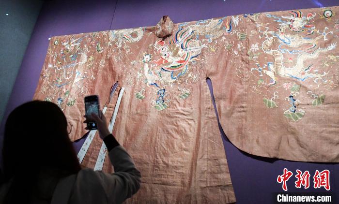 9月30日,观众参观明代“香色芝麻纱绣过肩蟒女长衫”。中新网