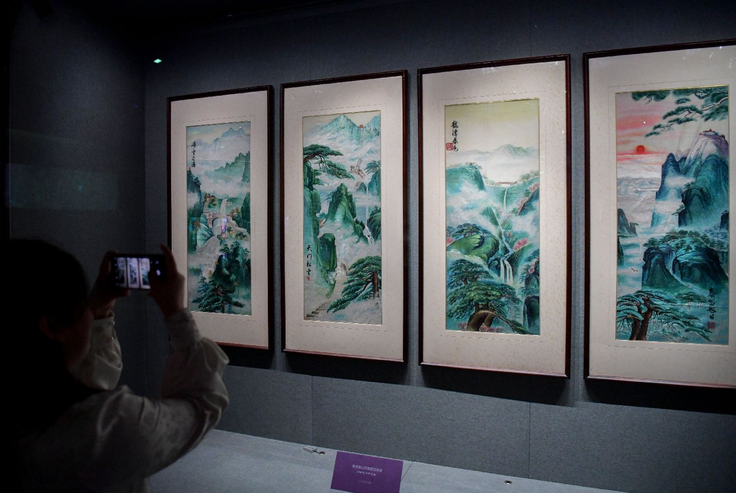 9月30日,以“古韵新织 锦绣齐鲁—献礼新中国成立75周年”为主题的2024鲁锦鲁绣推广展示季在山东济南正式启动。同步开启的鲁锦鲁绣文化展,陈列文物和展品约113组、145件,循序渐进地勾勒出鲁锦鲁绣从传统到现代的创新蝶变。图为观众参观鲁绣作品“泰山四景图四条屏”。中新社