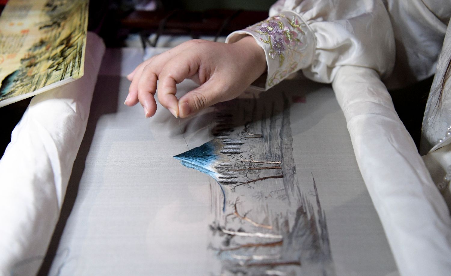 9月30日,技工展示鲁绣刺绣技法。中新社