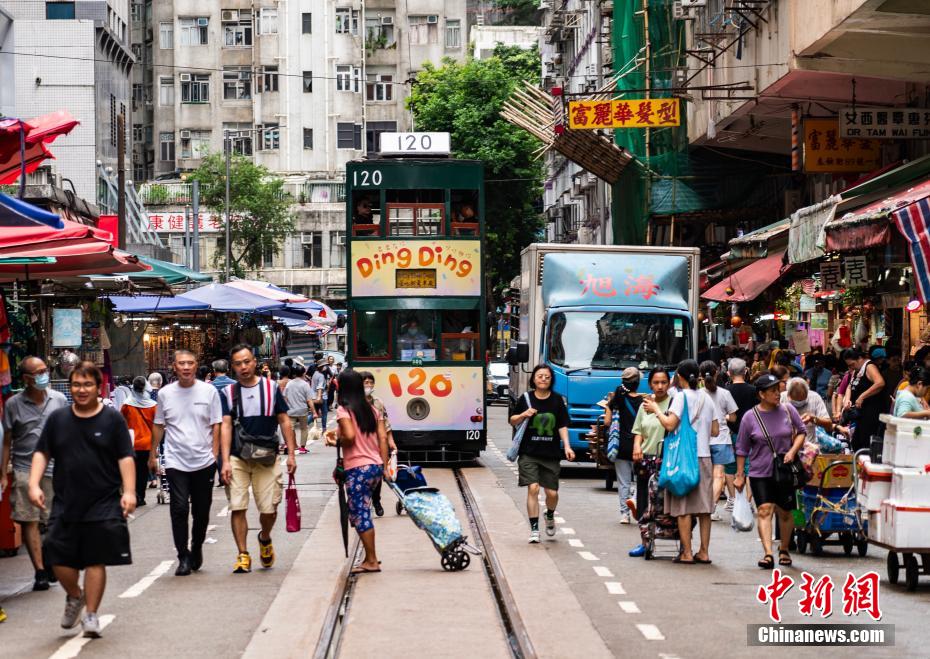 东起筲箕湾,西至坚尼地城,时至今日,位于香港岛北侧的30公里长轨道上依然不时响起“叮叮”之声,这便是被爱称为“叮叮车”的香港电车所过之处发出的“声音符号”,在香港人的记忆中,“叮叮车”早已超出简单的交通工具范畴,是一段历久弥新的时代之音。图为保持着第五代车型设计涂装、增添了车身周年庆祝海报的120号电车穿行于北角春秧街的人群中。