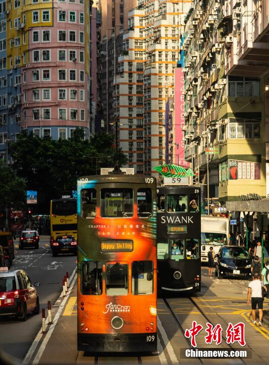 丰富多彩的电车行驶在香港的街道上。