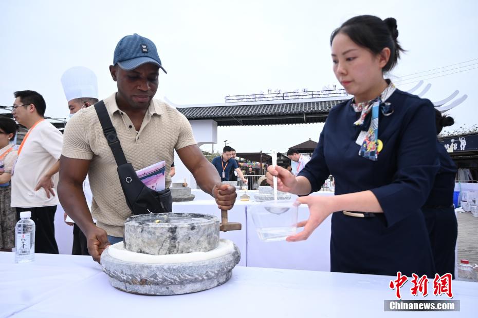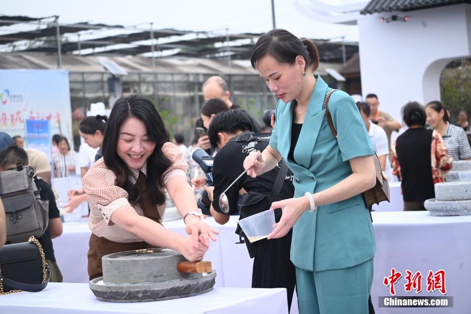 9月29日,2024年中国(垫江)石磨豆花美食文化节在重庆垫江启动。海内外民众走进垫江,通过制作豆花、食用豆花等方式,体验当地的美食文化。据悉,垫江是“中国石磨豆花美食之乡”,当地后续还会推出桨板公开赛、房车露营等系列活动,以推动商文旅体深度融合。图为民众在体验垫江石磨豆花的制作过程。