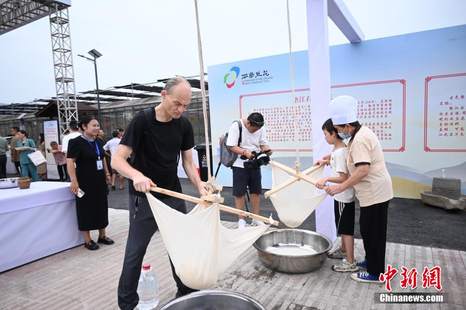 国际友人在体验豆花制作的工序。