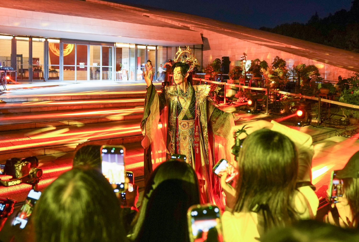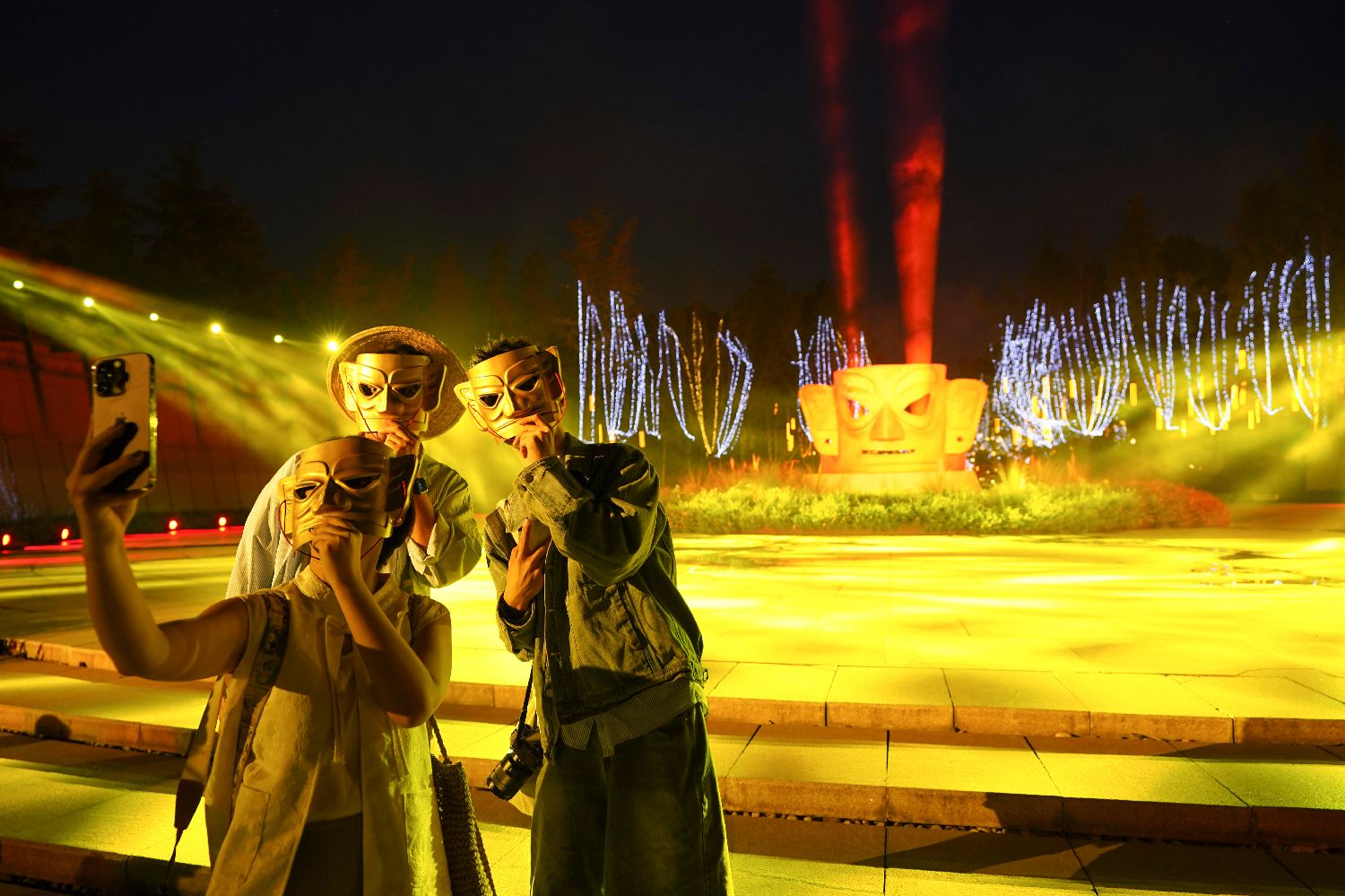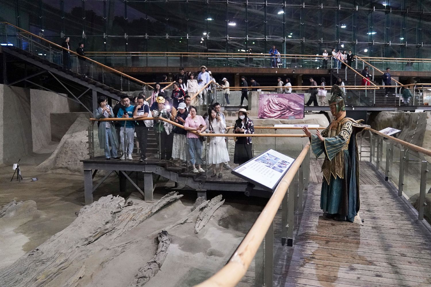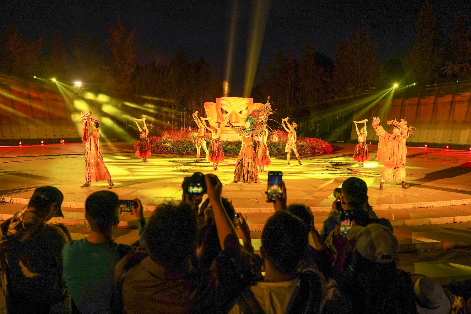 9月30日,在金沙遗址博物馆,观众观看“夜游金沙·穿越古蜀——博物馆情景式导览演出秀”。