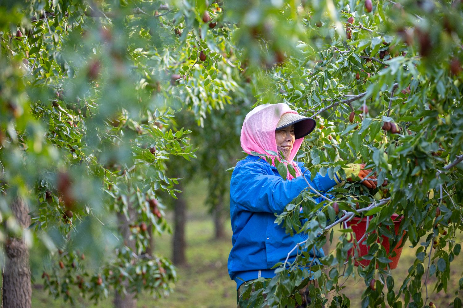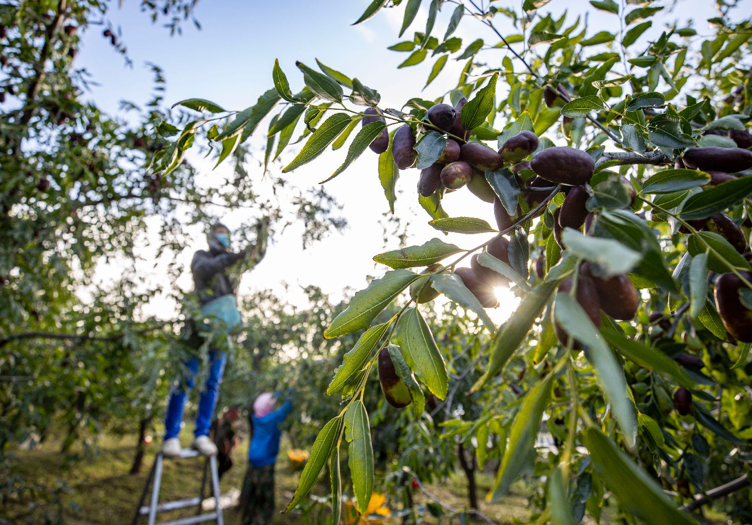 9月30日,在宁夏灵武市东塔镇马场湖长枣种植基地内,农户在采摘长枣。