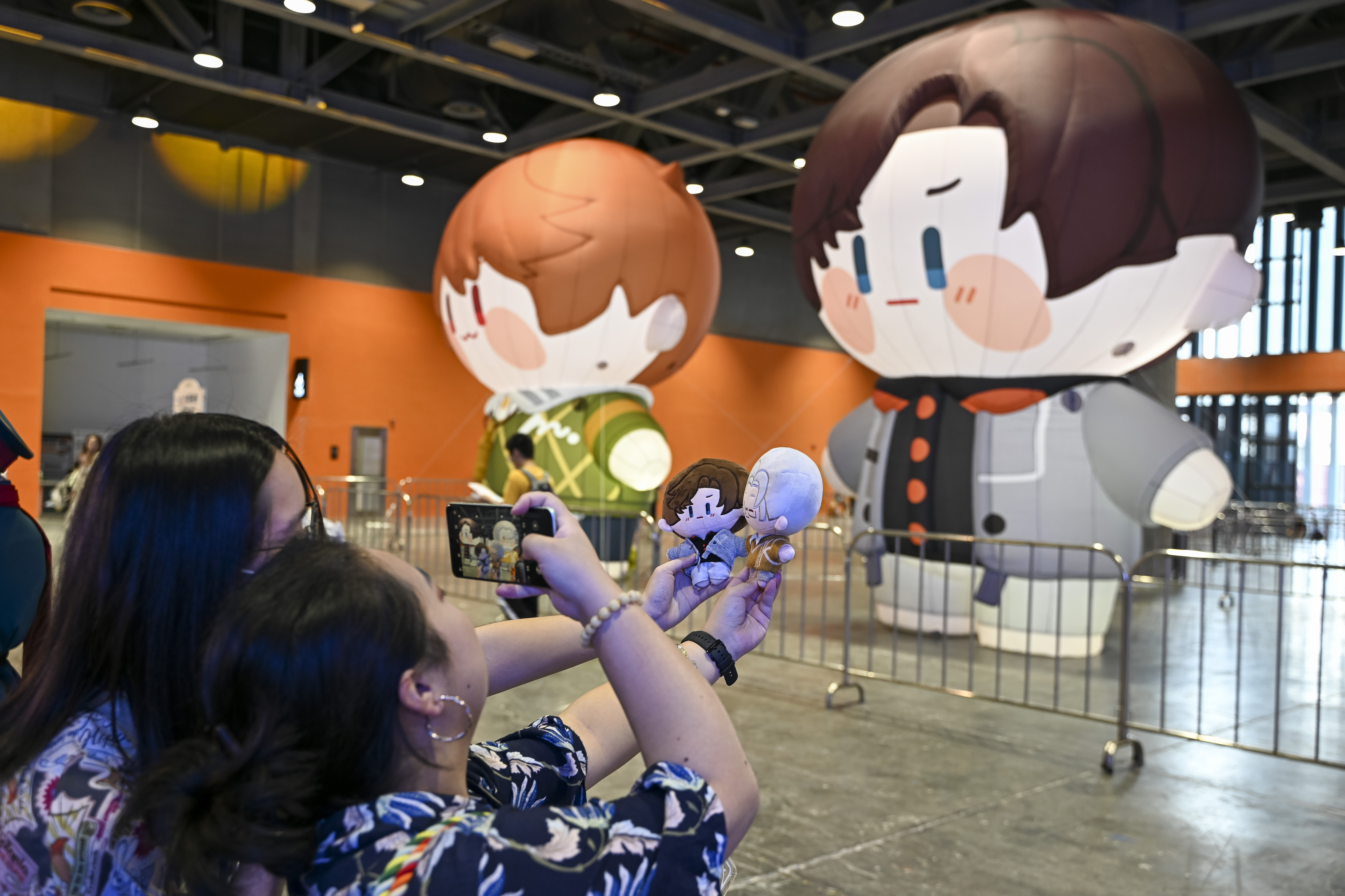 10月2日,第十七届中国国际漫画节动漫游戏展在位于广东广州的保利世贸博览馆开幕。图为动漫游戏爱好者在展会上手持动漫游戏周边产品留影。中新社