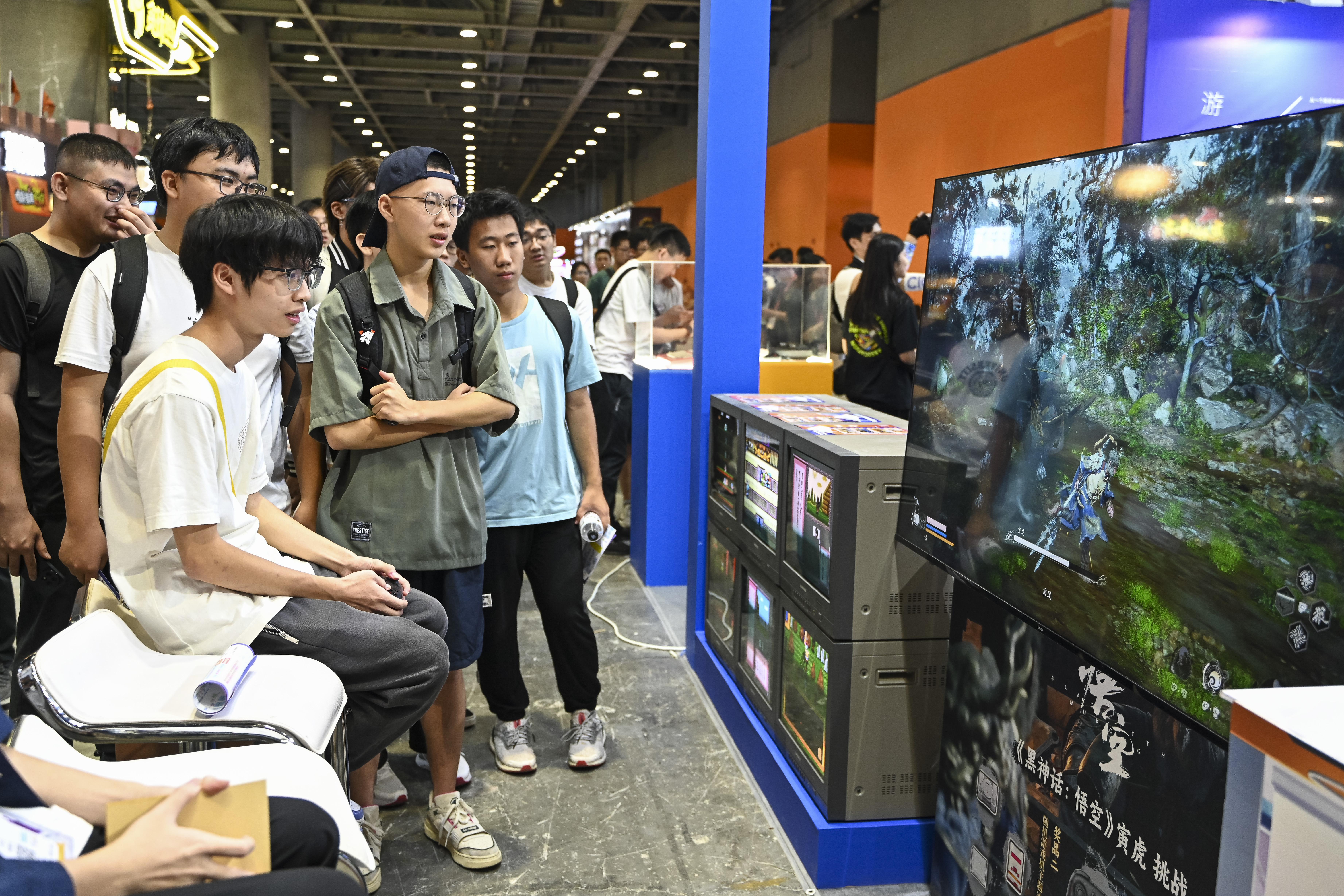 10月2日,动漫游戏爱好者在展会上体验游戏《黑神话:悟空》。中新社