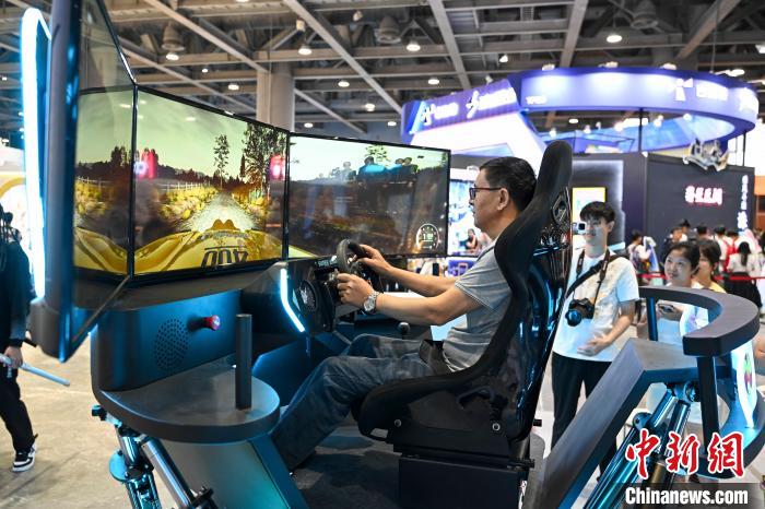 动漫游戏爱好者在展会上体验赛车模拟器。中新网