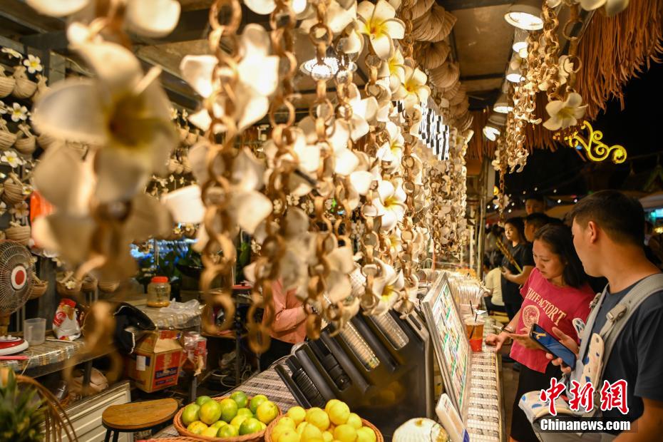 10月2日,在云南西双版纳傣族自治州景洪市告庄西双景星光夜市,游客购买特色饮品。中新网