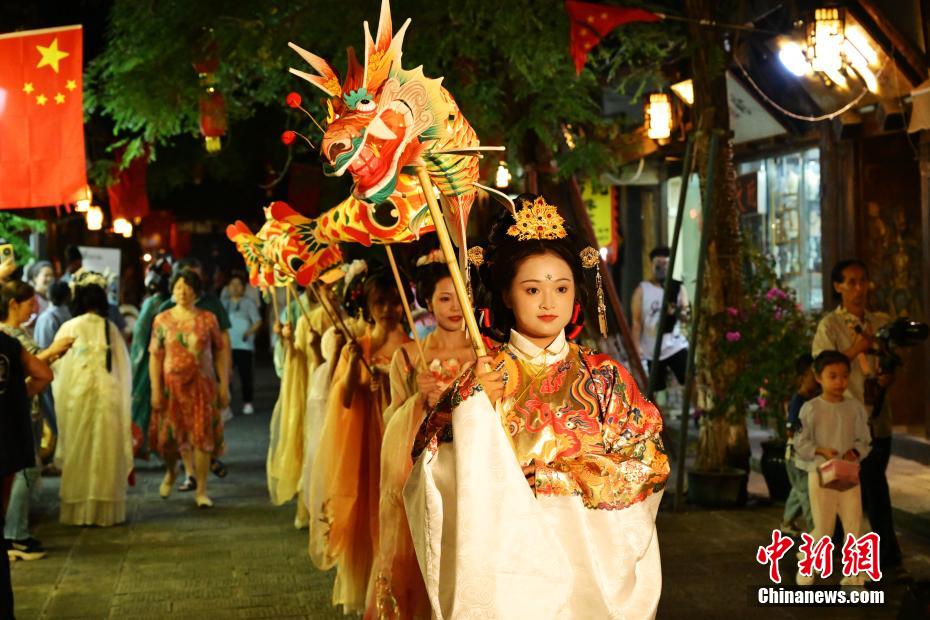 10月2日,游客在四川阆中古城表演月下鱼灯。中新网