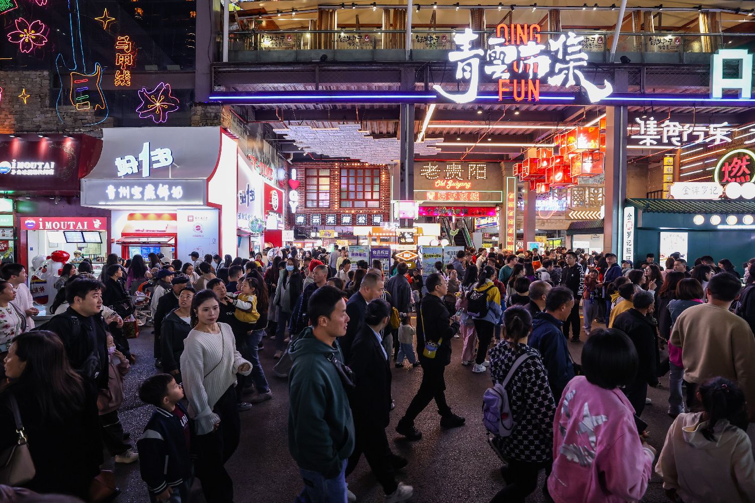 “十一”黄金周假期,中国各景区迎来大批游客,众多游客选择夜间出游、消费,感受夜间出游的别样乐趣。图为10月2日晚,游客在贵州贵阳青云市集游览。中新社