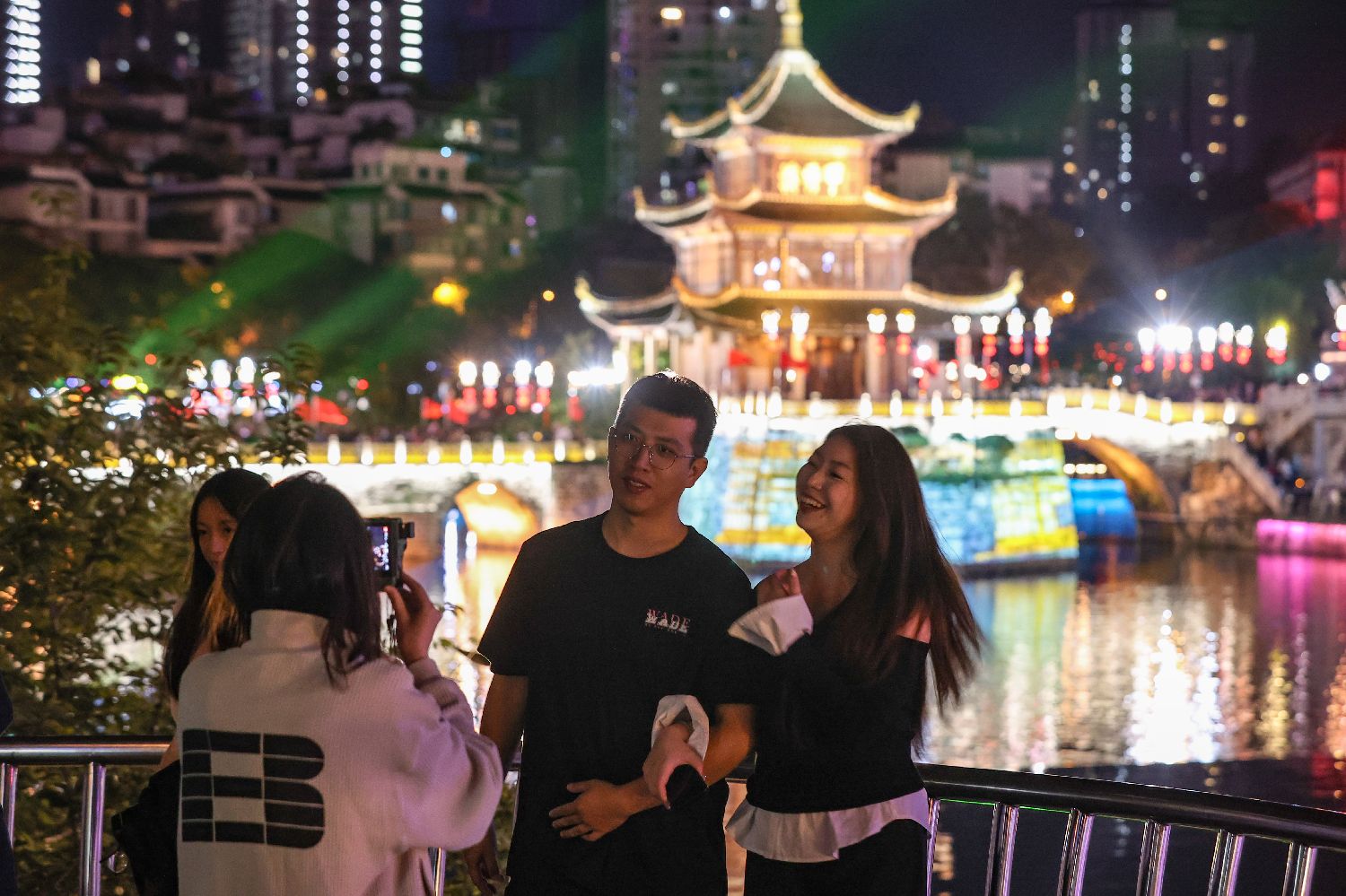 10月2日晚,游客在贵州贵阳甲秀楼景区拍照。中新社