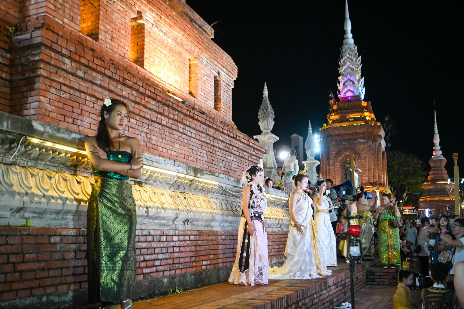 10月2日,在云南西双版纳傣族自治州景洪市告庄西双景星光夜市,游客身着民族服饰拍照,感受民族风情。中新社