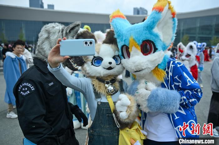 10月5日,活动现场粉丝与Coser(动漫角色扮演者)合影。中新网