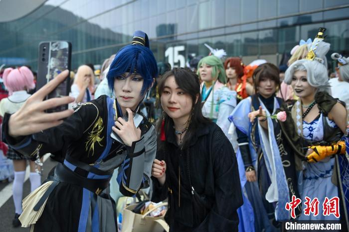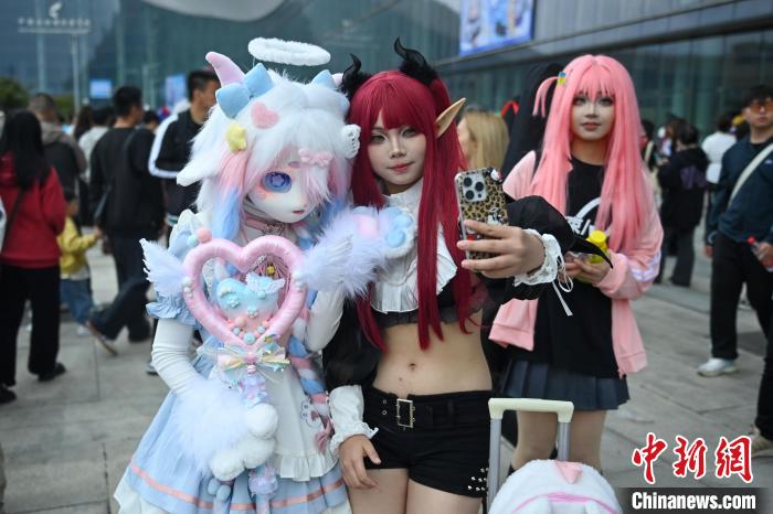 10月5日,活动现场打扮成动漫角色爱好者手机自拍合影。中新网