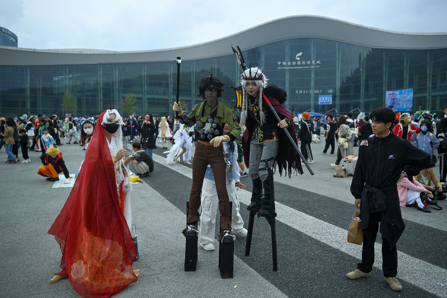 10月5日,正在四川成都举行的第十七届世界线动漫展吸引了省内外上万动漫爱好者汇聚一堂。图为活动现场打扮成动漫角色的爱好者们。中新社