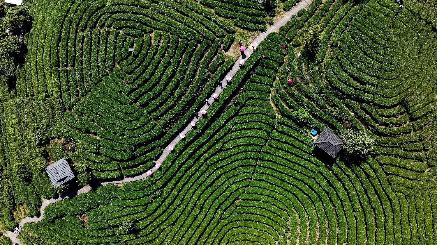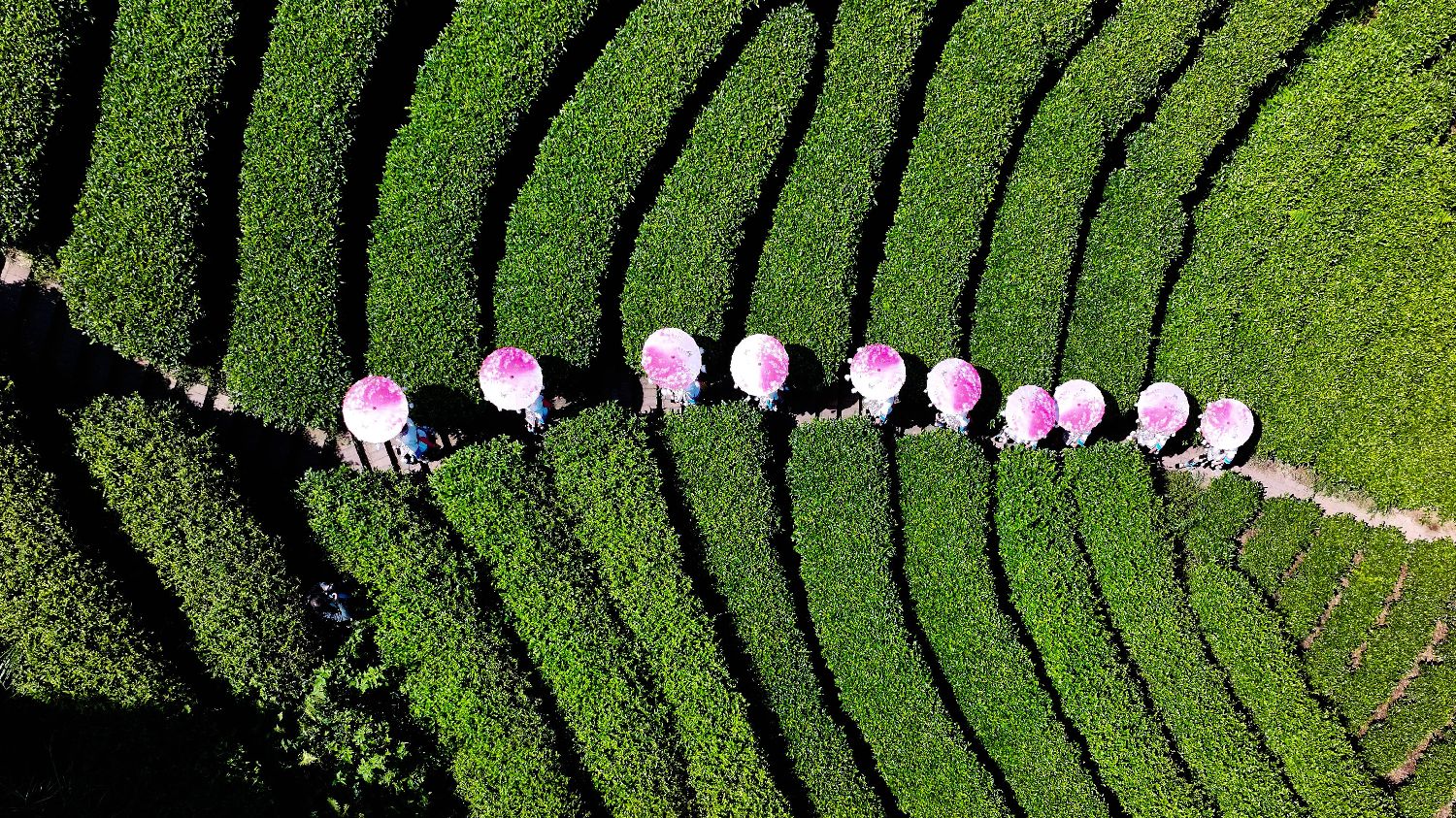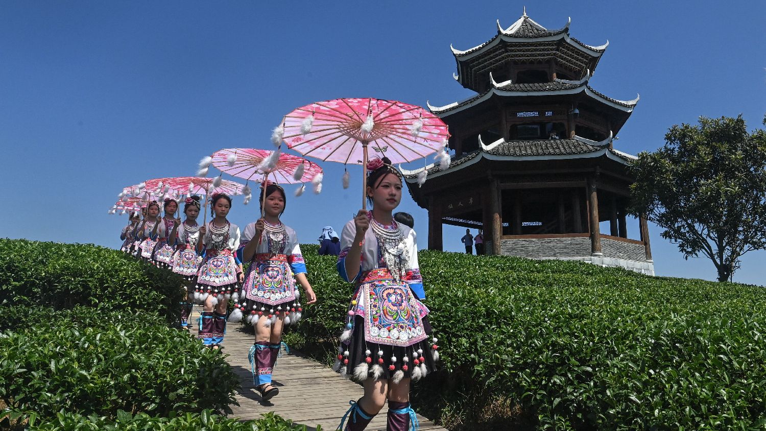 晨观日出云海,午品茶叶清香,晚赏茶山夕照。十一假期,地处湘、滇、桂三省交界处的广西三江侗族自治县布央仙人山茶园推出系列游园活动,吸引众多游客前去体验。图为10月5日,在广西三江侗族自治县布央仙人山茶园,侗族姑娘进行游园活动。