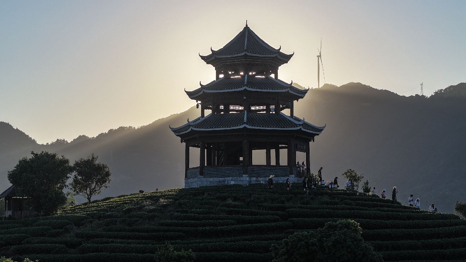 10月4日,在广西三江侗族自治县布央仙人山茶园,游客在观赏茶山夕照景观。