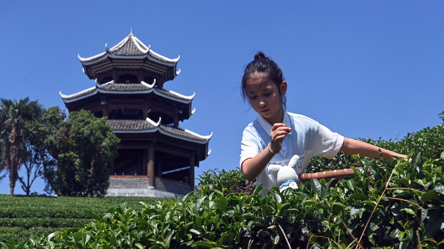 10月5日,在广西三江侗族自治县布央仙人山茶园,一名小朋友在体验采茶。