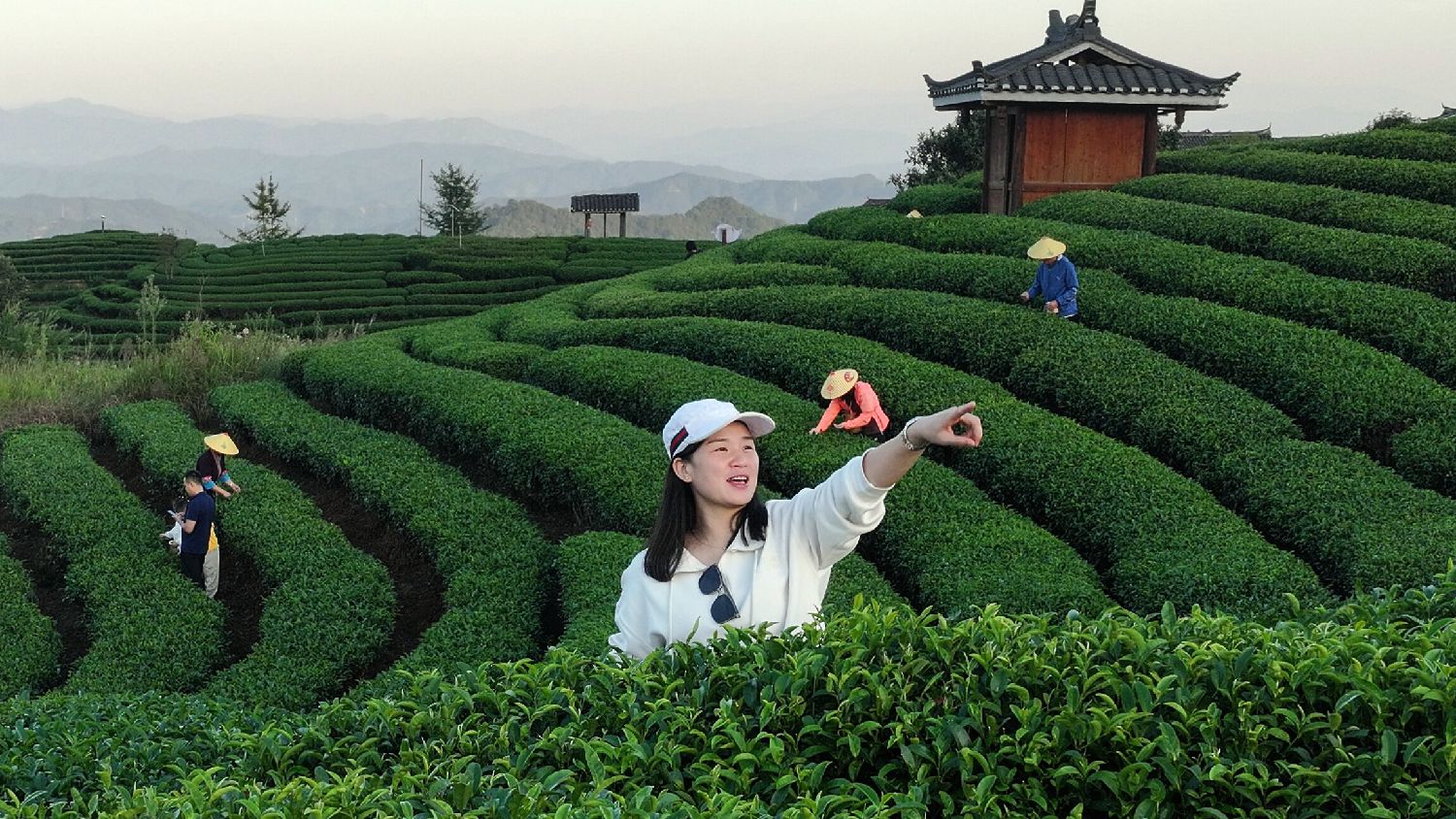 10月4日,游客在广西三江侗族自治县布央仙人山茶园游玩。