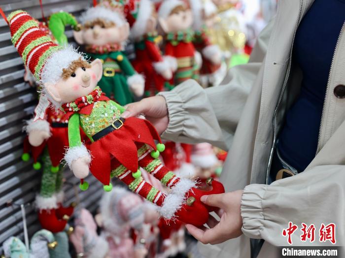 10月10日,浙江义乌国际商贸城一家店铺的店员介绍店铺今年热销的圣诞玩偶。中新网