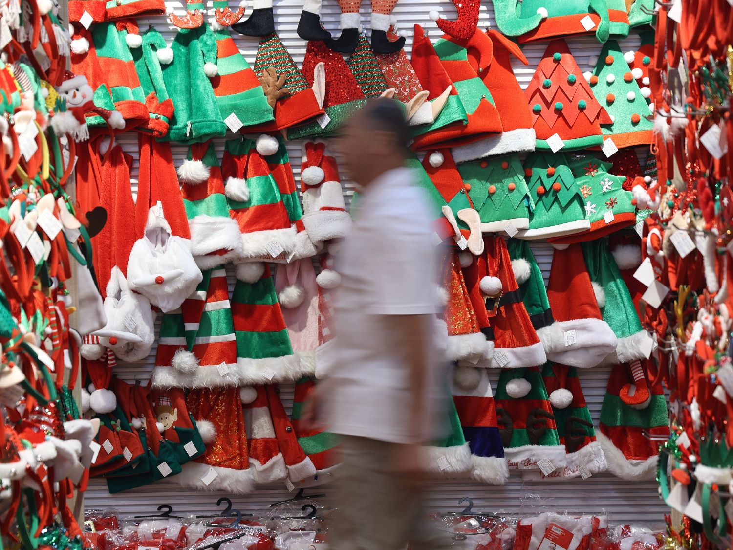 圣诞节渐近,义乌国际商贸城圣诞用品开始热销,当地拥有超过800家圣诞用品商户,每年向100多个国家和地区出口数万种圣诞用品。图为10月10日,一位采购商路过浙江义乌国际商贸城一家圣诞用品店铺。中新社