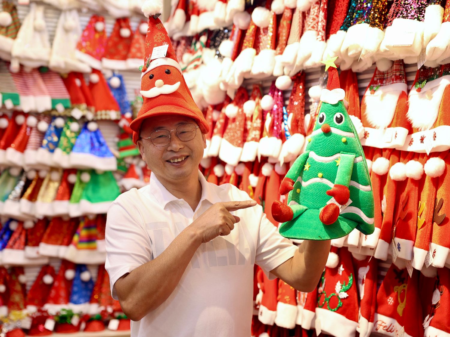 10月10日,浙江义乌商户蒋江平展示店铺热销的圣诞帽款式。中新社