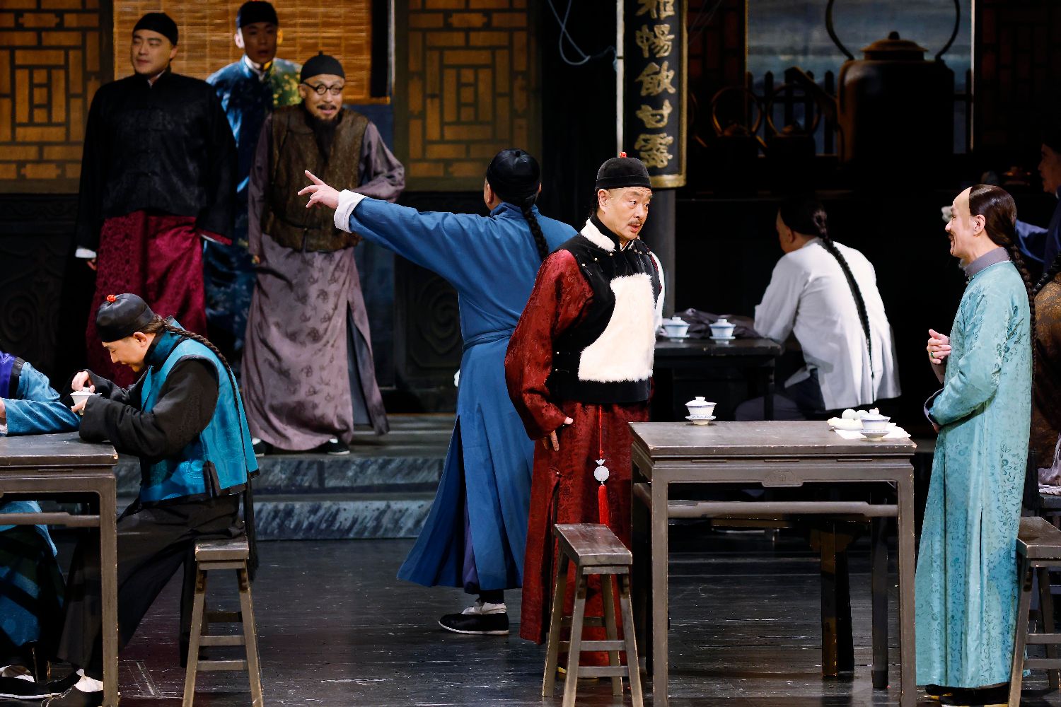 10月14日至11月9日,北京人民艺术剧院大规模赴上海驻演,带来《茶馆》《哗变》《日出》《杜甫》《正红旗下》五部精品力作。图为10月13日,话剧《茶馆》演出现场。中新社