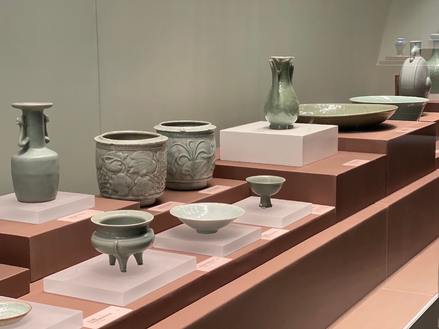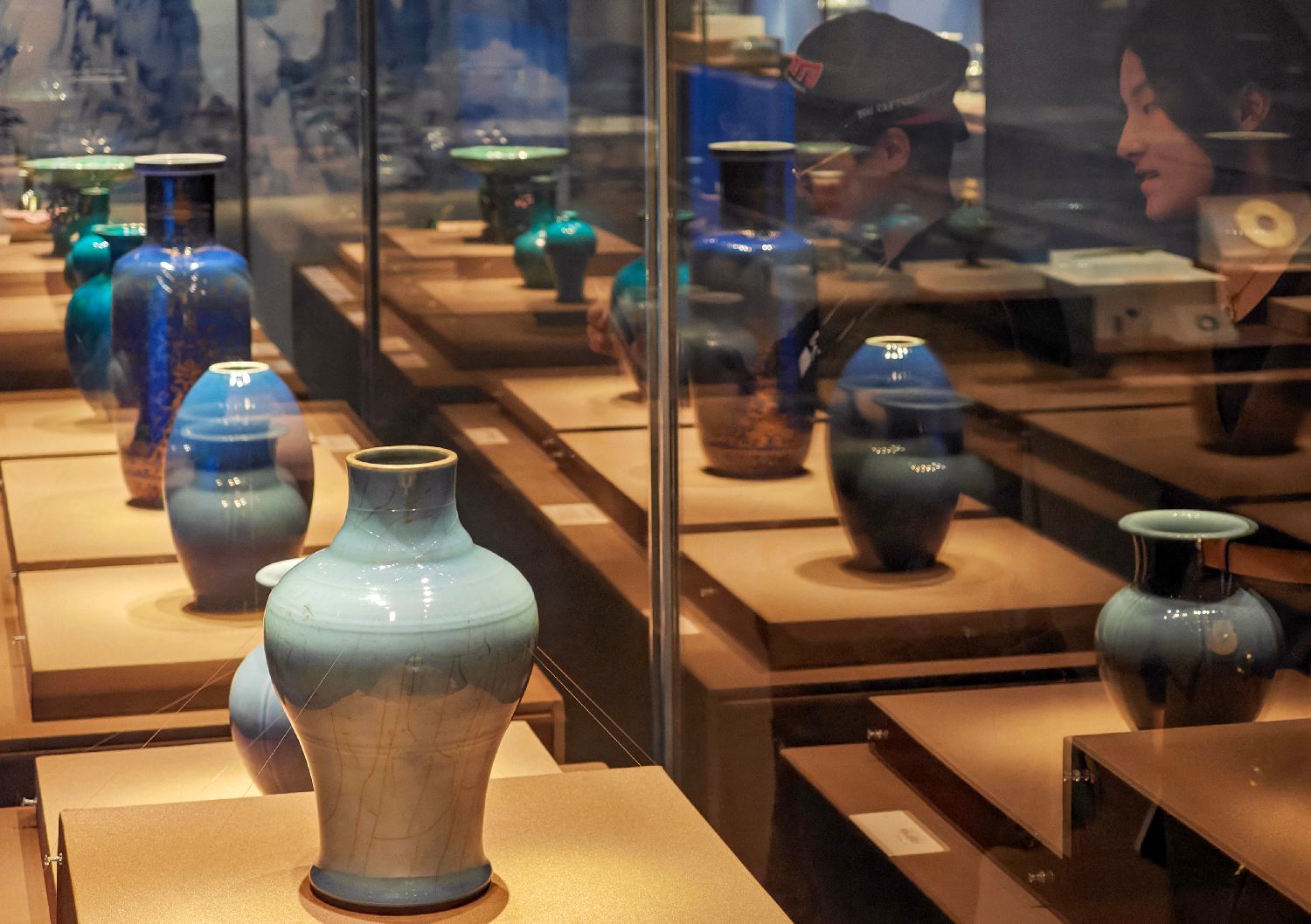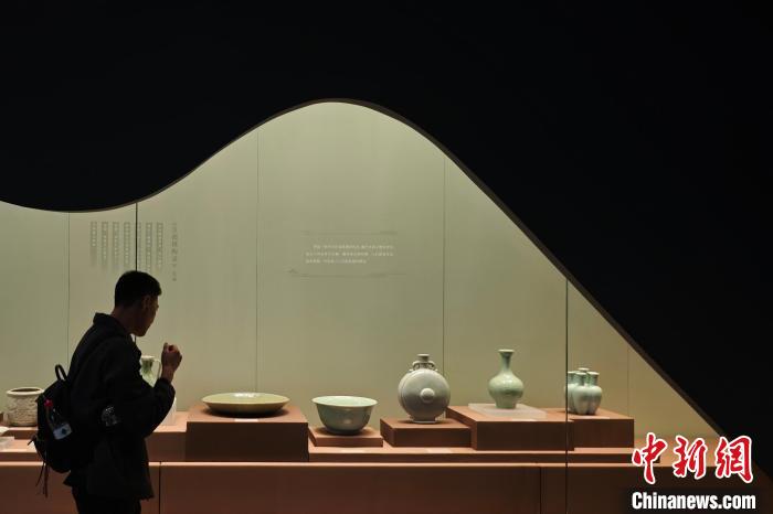 10月15日,观众在六朝博物馆举办的“只此中国色——青”特展上欣赏粉青釉模印缠枝花卉夔凤莲蓬口瓶(右一)、仿汝釉双耳抱月瓶(右二)、粉青釉印折枝花果纹大碗(右三)等文物。中新网