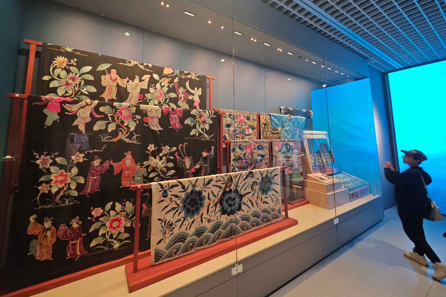 10月15日,观众在六朝博物馆举办的“只此中国色——青”特展上欣赏蜀绣灯彩绣兰花桌围、蜀绣长寿富贵平金桌围等展品。中新社