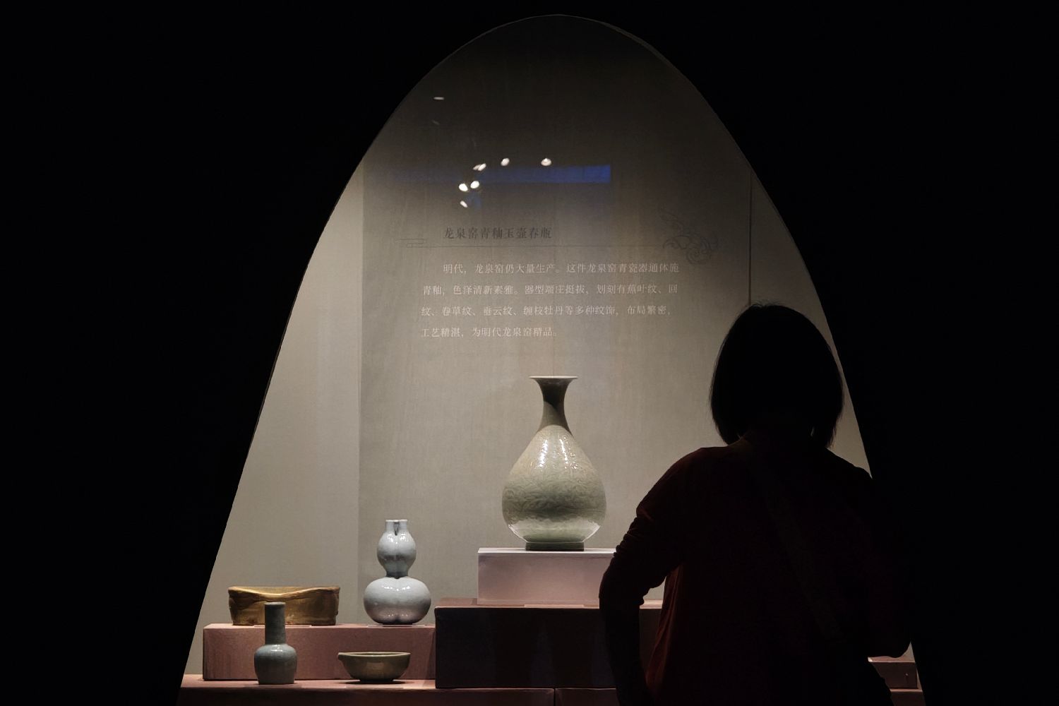 10月15日,观众在六朝博物馆举办的“只此中国色——青”特展上欣赏龙泉窑青釉玉壶春瓶(右一)等文物。中新社
