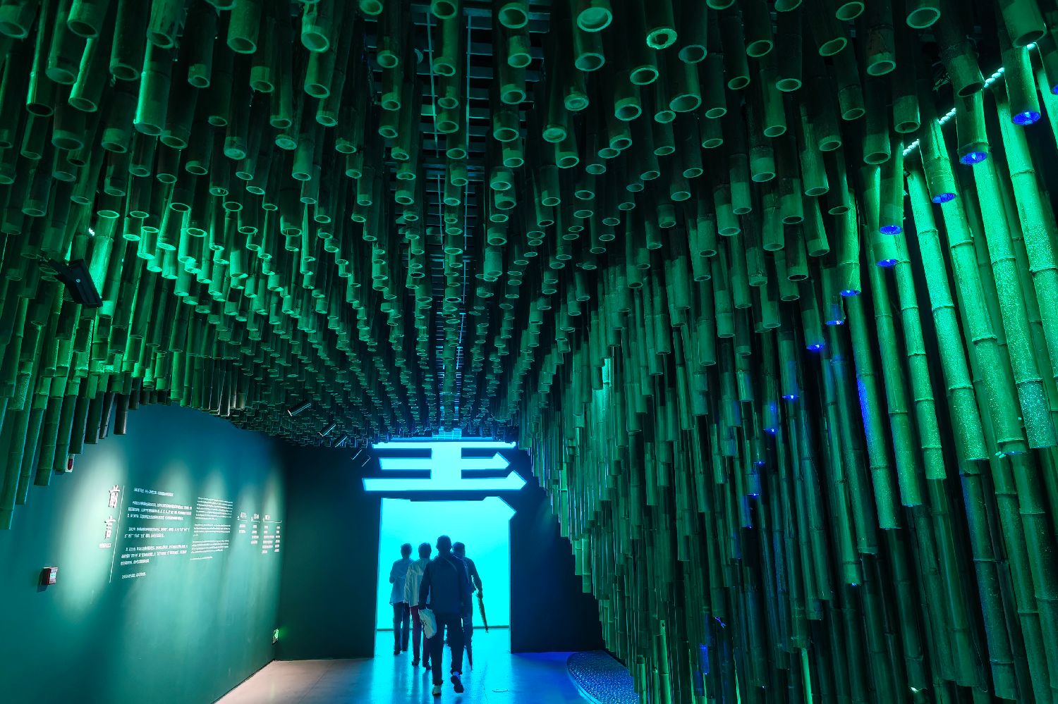 10月15日,观众在六朝博物馆举办的“只此中国色——青”特展上参观。中新社