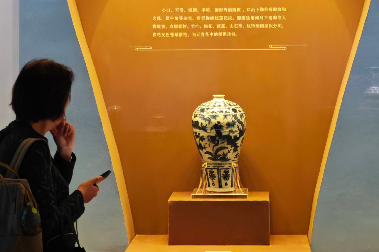 10月15日,观众在六朝博物馆举办的“只此中国色——青”特展上欣赏青花萧何月下追韩信图梅瓶。中新社