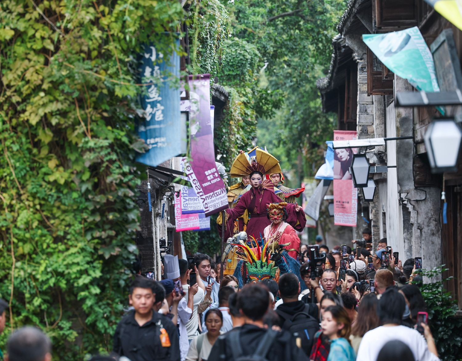 10月17日,第十一届乌镇戏剧节在浙江省桐乡市乌镇开幕。本届戏剧节有来自11个国家的24部特邀剧目,将带来86场演出。同时,汇聚各种艺术形式的2000场古镇嘉年华演出也将精彩呈现。此外,还有18部青年竞演剧目、11场小镇对话、9个戏剧工作坊展演、38场朗读会等丰富内容。图为乌镇戏剧节的古镇嘉年华踩街巡游。