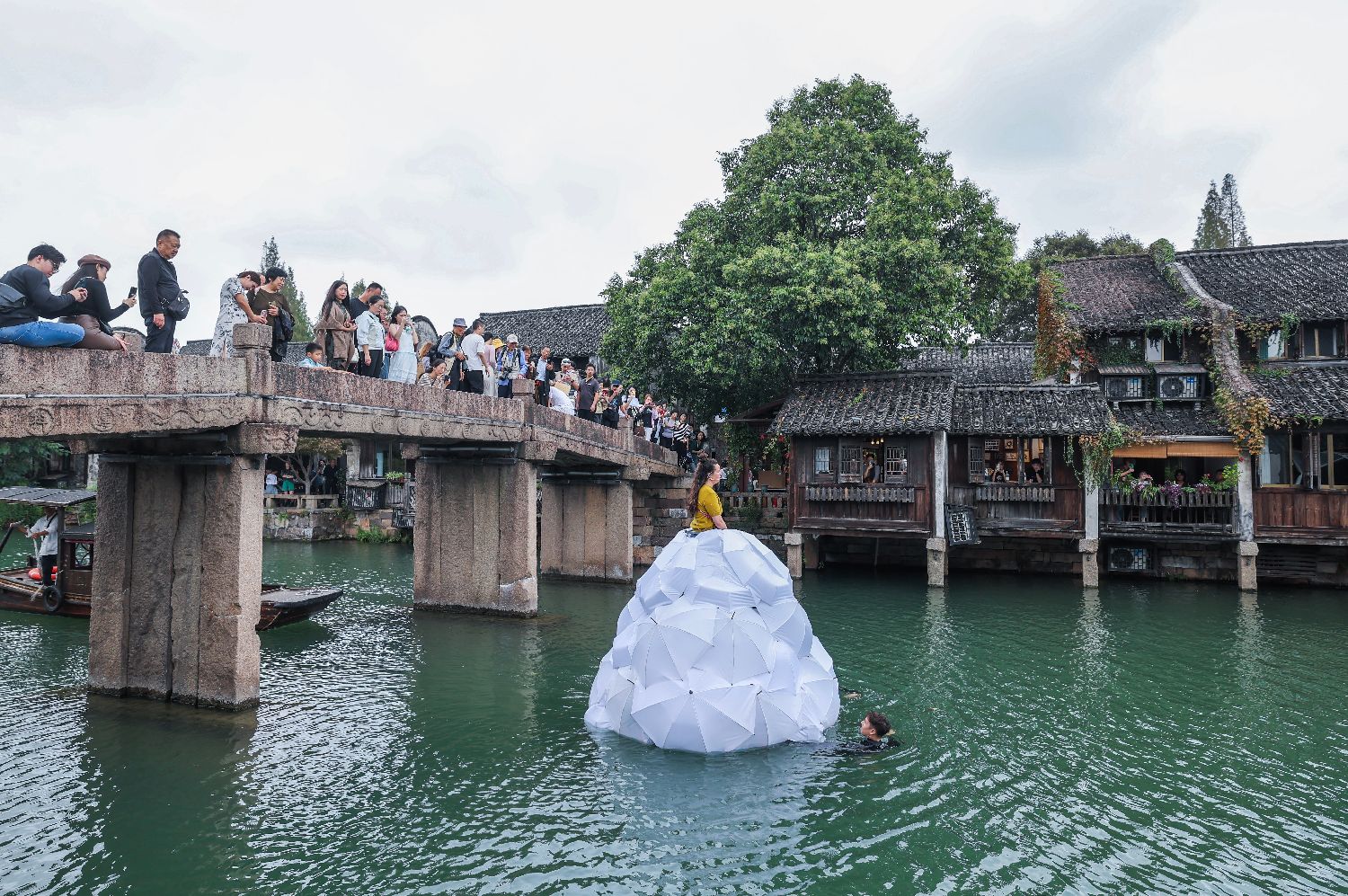 10月17日,乌镇戏剧节古镇嘉年华的水上歌剧《漂浮歌后》在排演。
