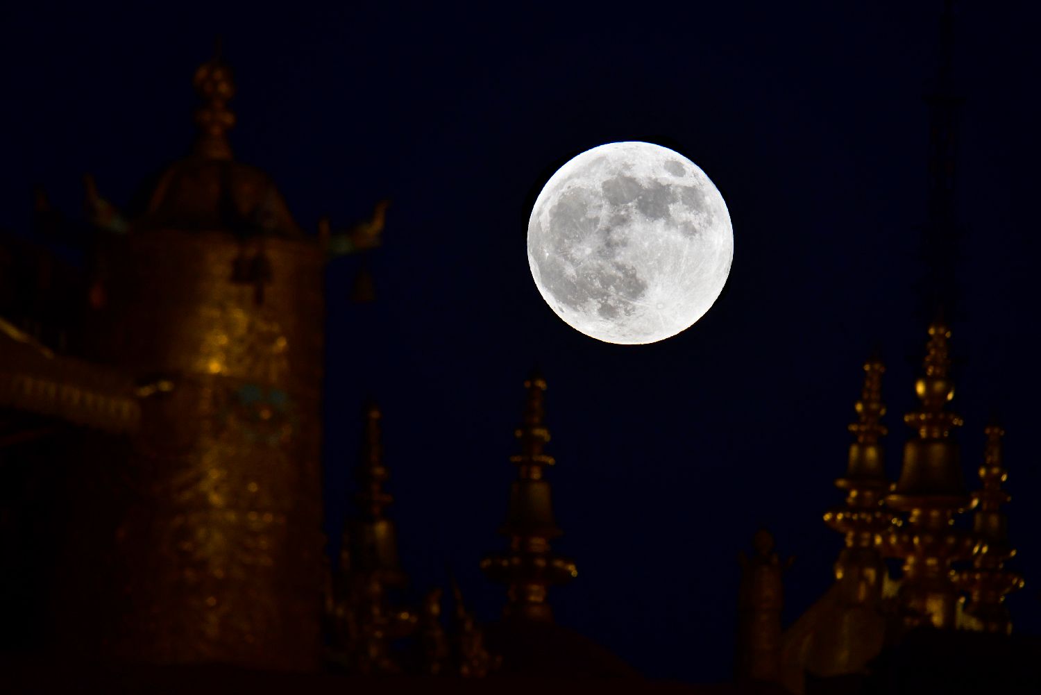 10月17日,“超级月亮”高悬西藏拉萨大昭寺上空。中新社
