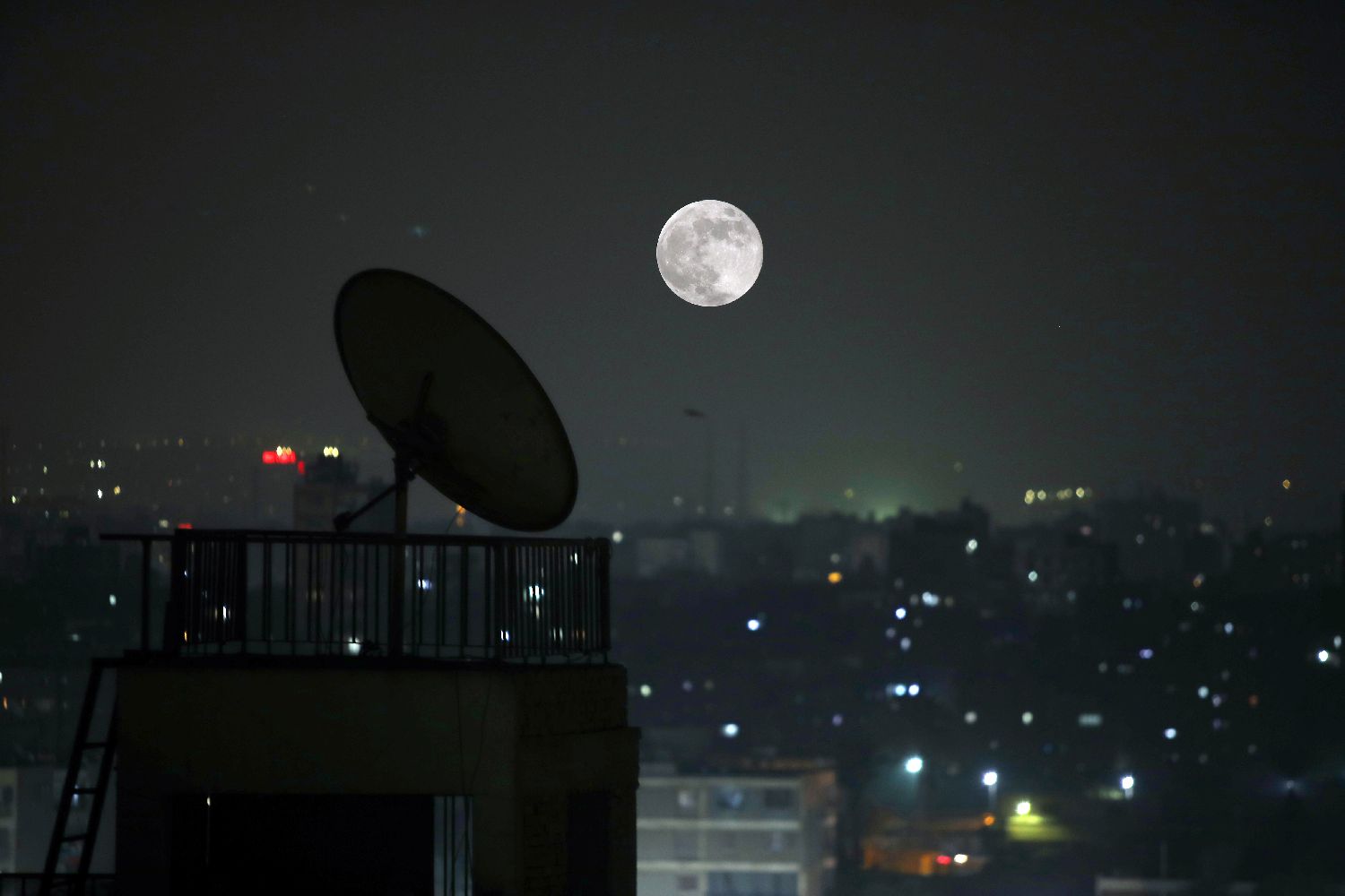 10月17日,一轮圆月在北马其顿首都斯科普里上空升起。新华社