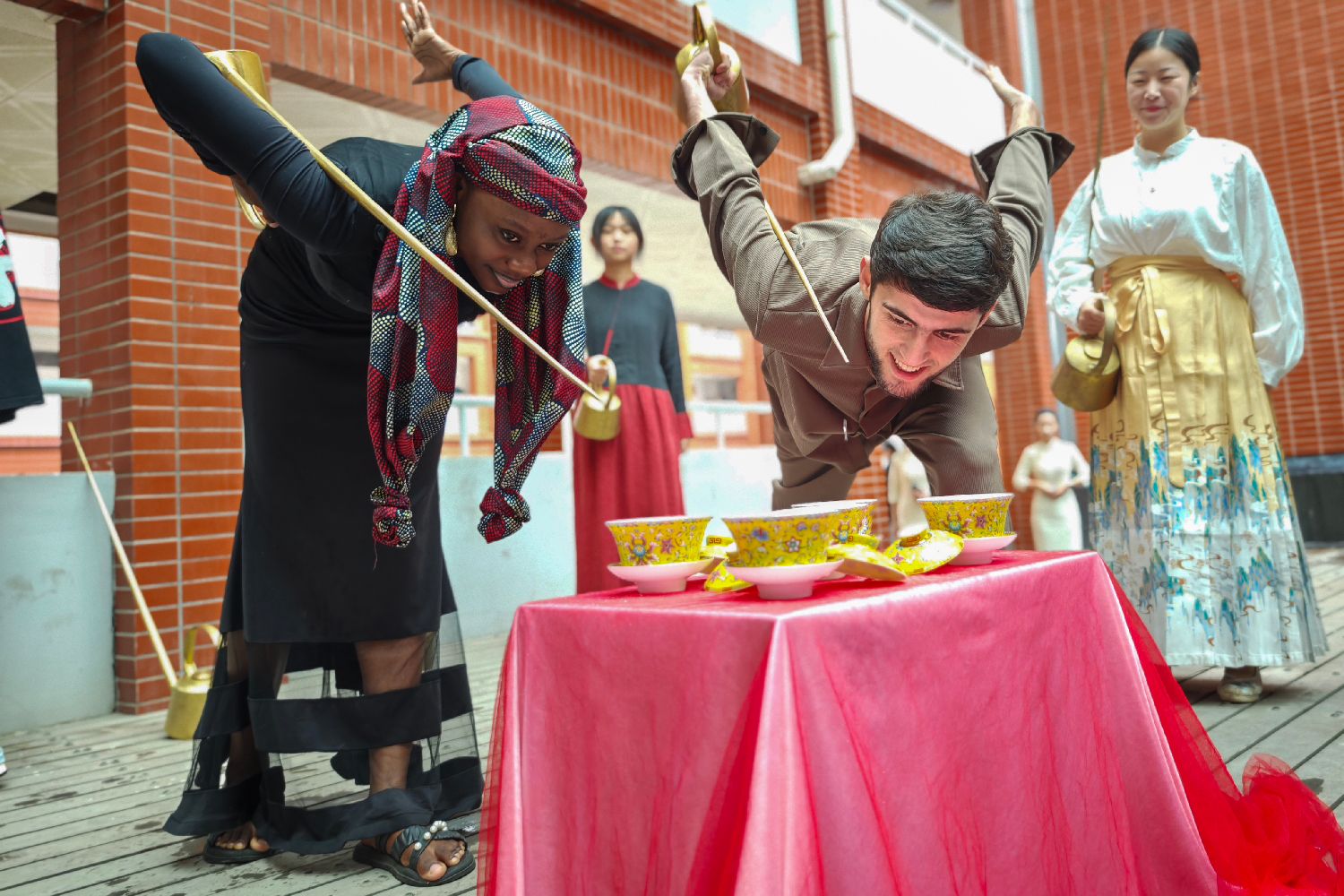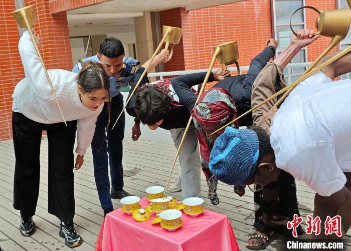 海外留学生体验长嘴壶茶艺,感受中国传统文化。中新网