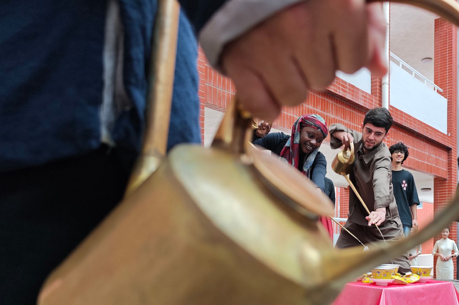 海外留学生体验长嘴壶茶艺,感受中国传统文化。中新社